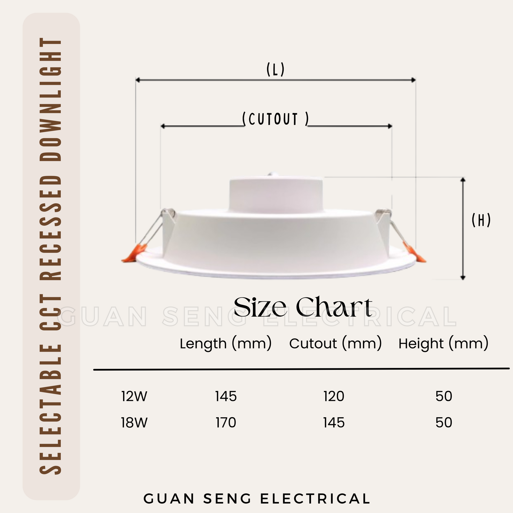 • Cut Out Size: ø120mm (12W), ø145mm (18W)